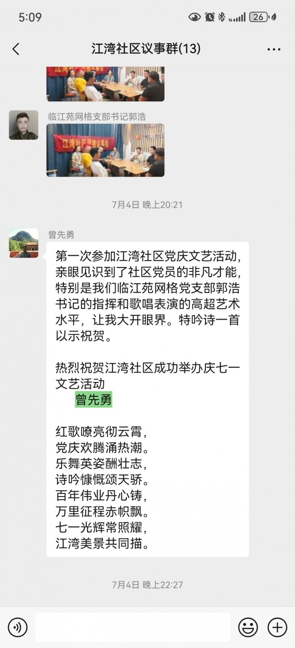 江湾社区党委:党员曾先勇参与七一活动有感