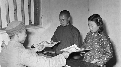 婚姻法实施后在农村里自由结婚的风气已很盛行。 1952年11月9日,湖南省醴陵县白兔潭村农民全裕盛(中)和孙桂华(右)向区政府登记结婚,司法干部把结婚证书递给他们。(来源/中国网)