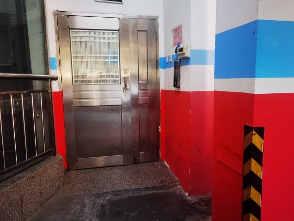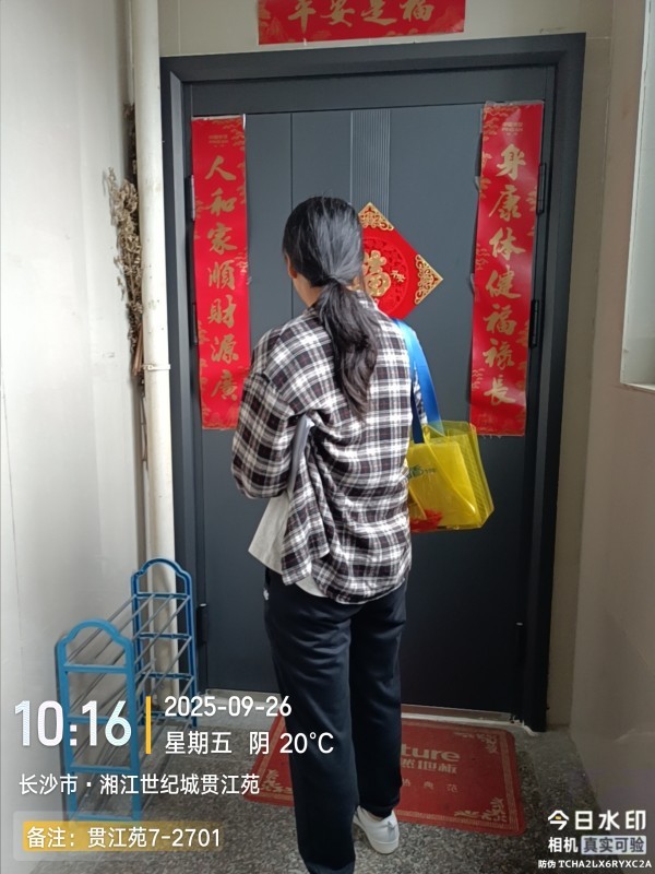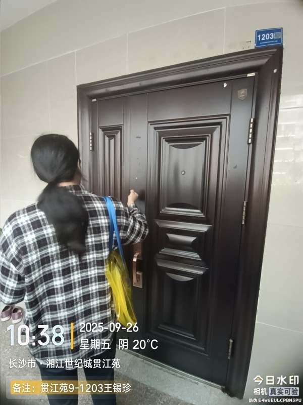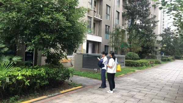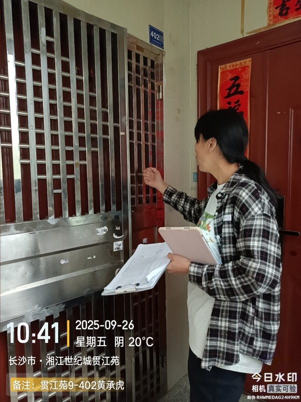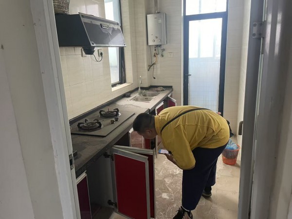 网格员和燃气工作人员在融5栋3206上户进行燃气检测。