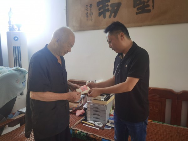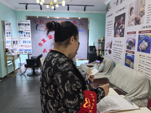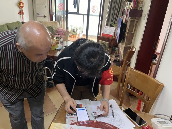 工作人员走访辖区居民,协助行动不便的老人进行退休认证
