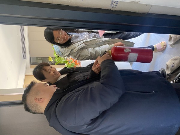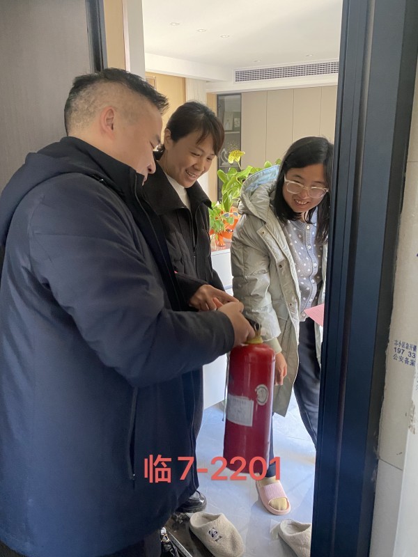 社区书记走访临江苑7-2201居民,发放社区温馨提示,教居民用灭火器。