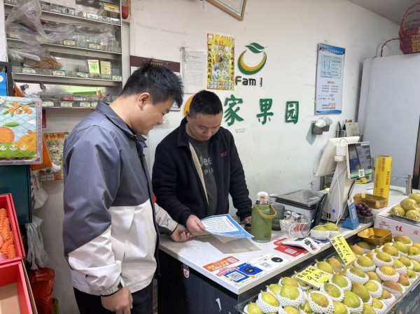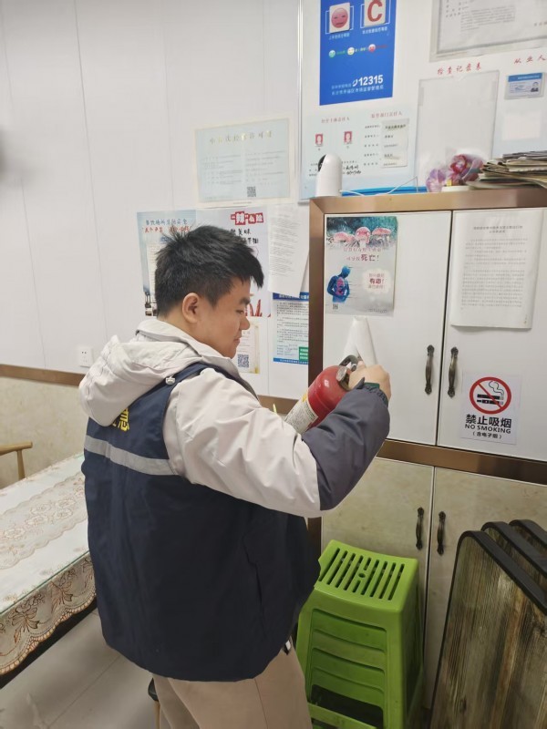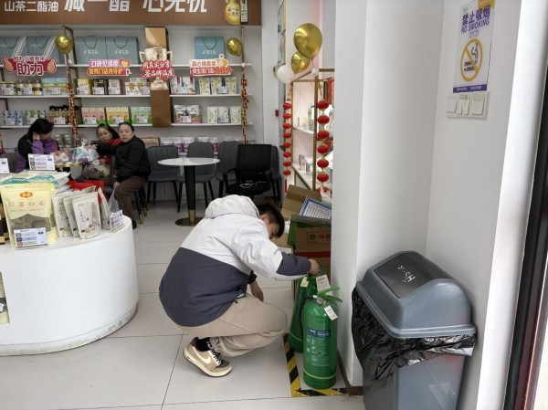 江湾社区工作人员对辖区门店开展灭火器专项安全检查,确保消防设施能正常使用。